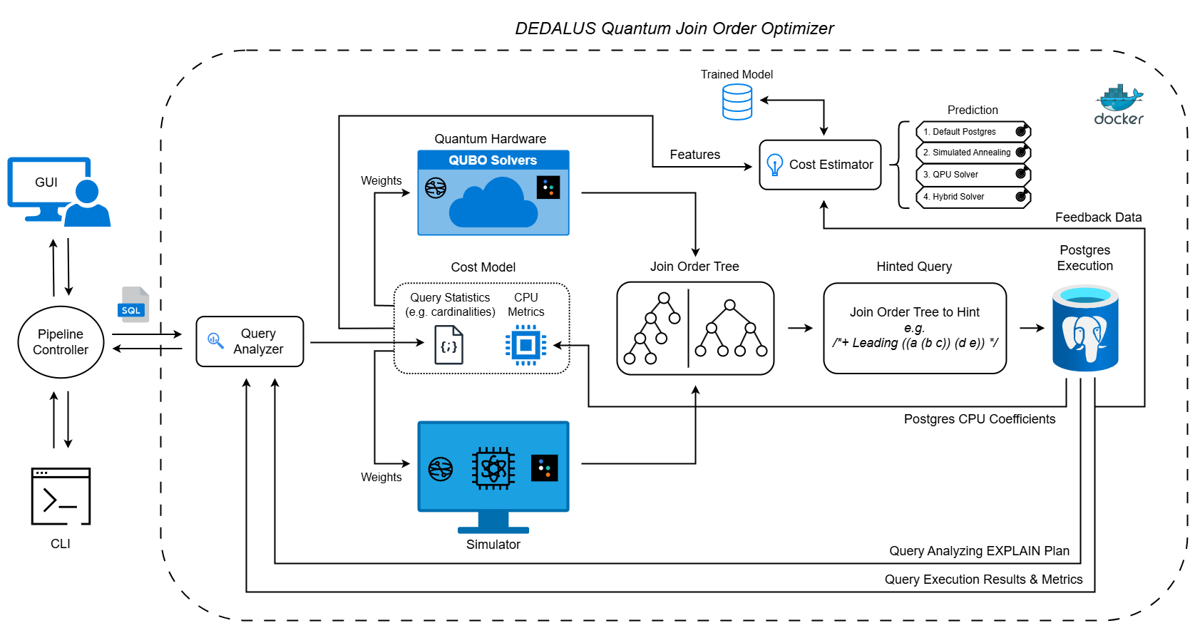 DEDALUS follows a modular, end-to-end architecture that transforms query answering of an SQL query into a quantum-amenable optimization (JOO – Join Order Optimization) problem and resulting in an optimized plan executed over a live database (PostgreSQL). Throughout this process, all available compute units may be utilized, including the classical CPU as well as Cloud QPUs and Hybrid Systems.